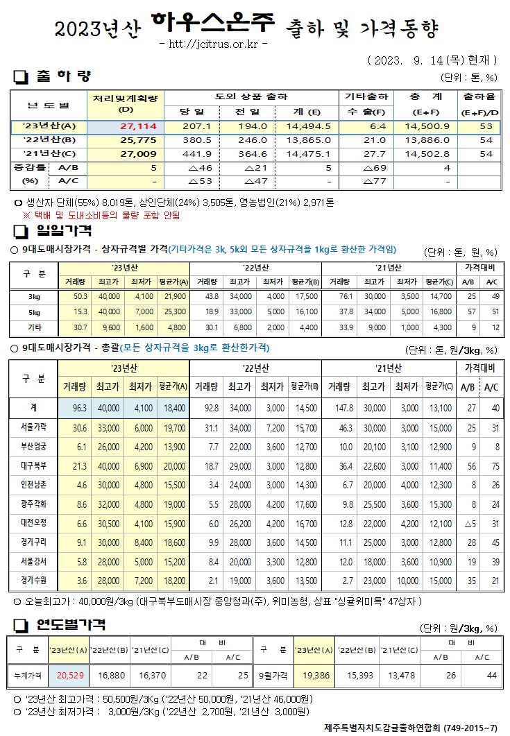[하우스온주]2023년산 출하 및 가격동향(9/14)