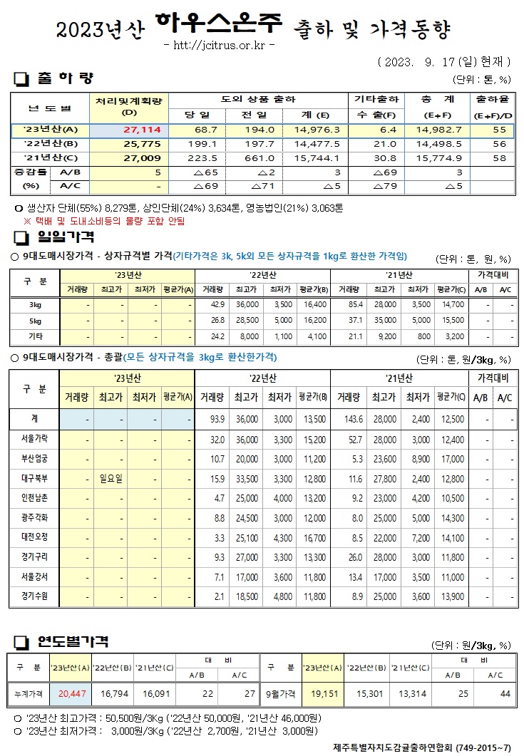 [하우스온주]2023년산 출하 및 가격동향(9/17)