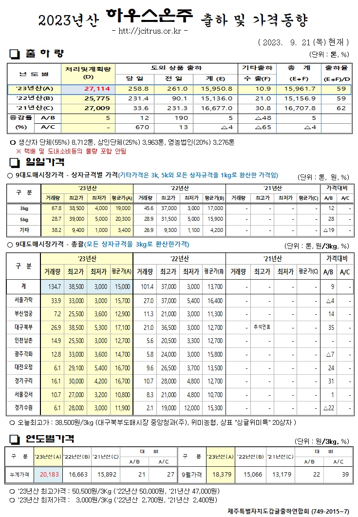 [하우스온주]2023년산 출하 및 가격동향(9/21)
