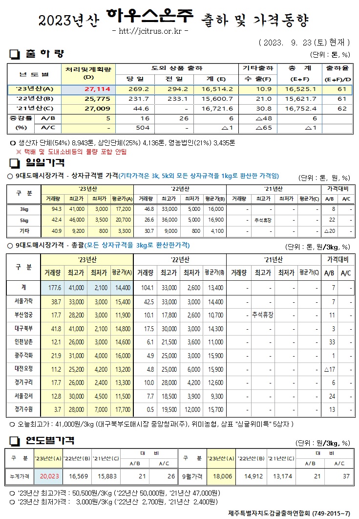 [하우스온주]2023년산 출하 및 가격동향(9/23)