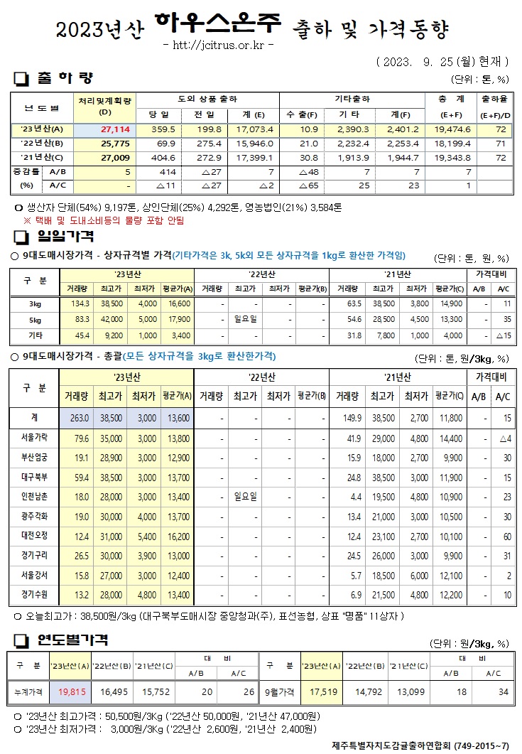 [하우스온주]2023년산 출하 및 가격동향(9/25)