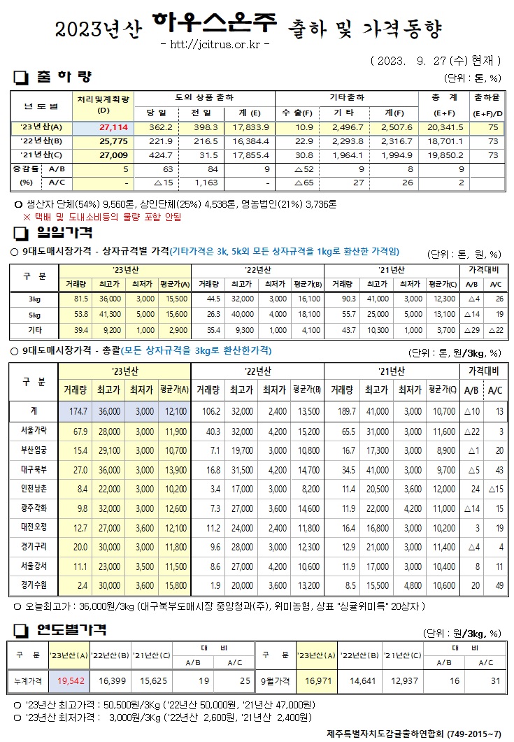 [하우스온주]2023년산 출하 및 가격동향(9/27)