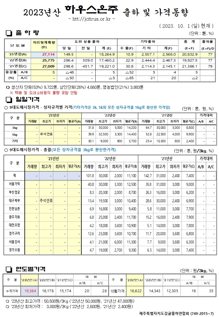 [하우스온주]2023년산 출하 및 가격동향(10/01)