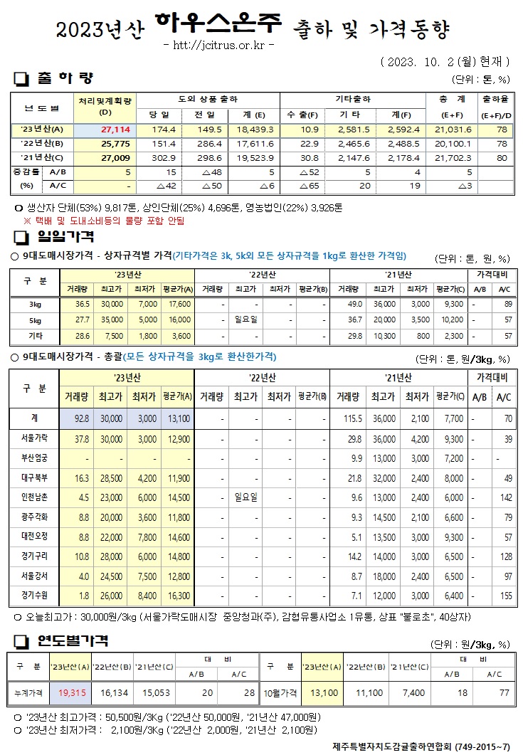 [하우스온주]2023년산 출하 및 가격동향(10/02)