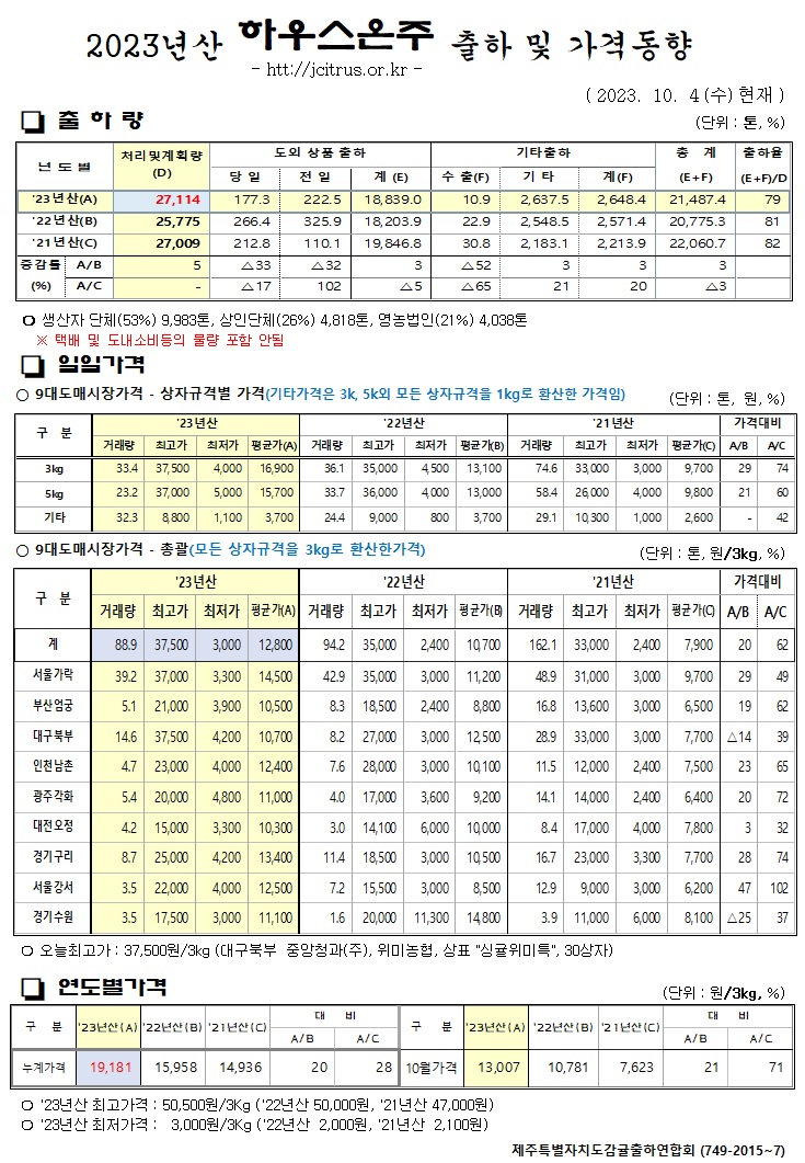 [하우스온주]2023년산 출하 및 가격동향(10/4)