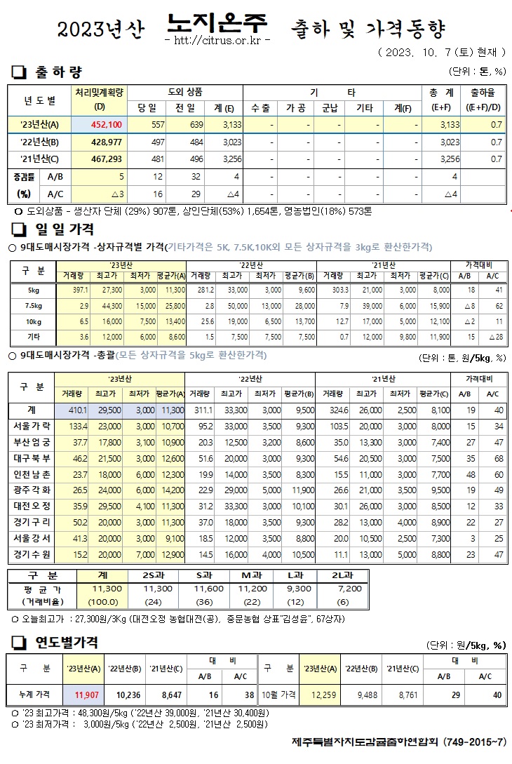 [노지온주]2023년산 출하 및 가격동향(10/7)