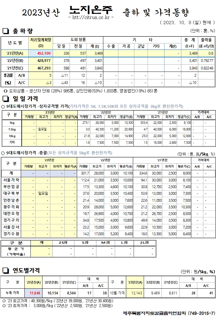 [노지온주]2023년산 출하 및 가격동향(10/8)