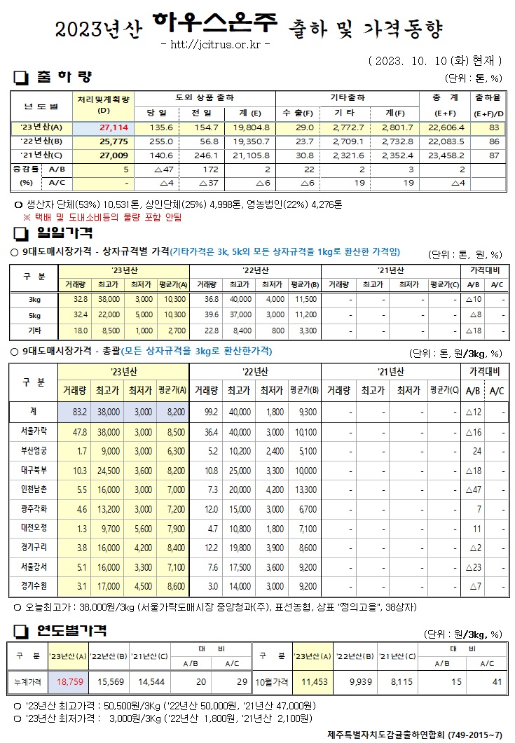 [하우스온주]2023년산 출하 및 가격동향(10/10)