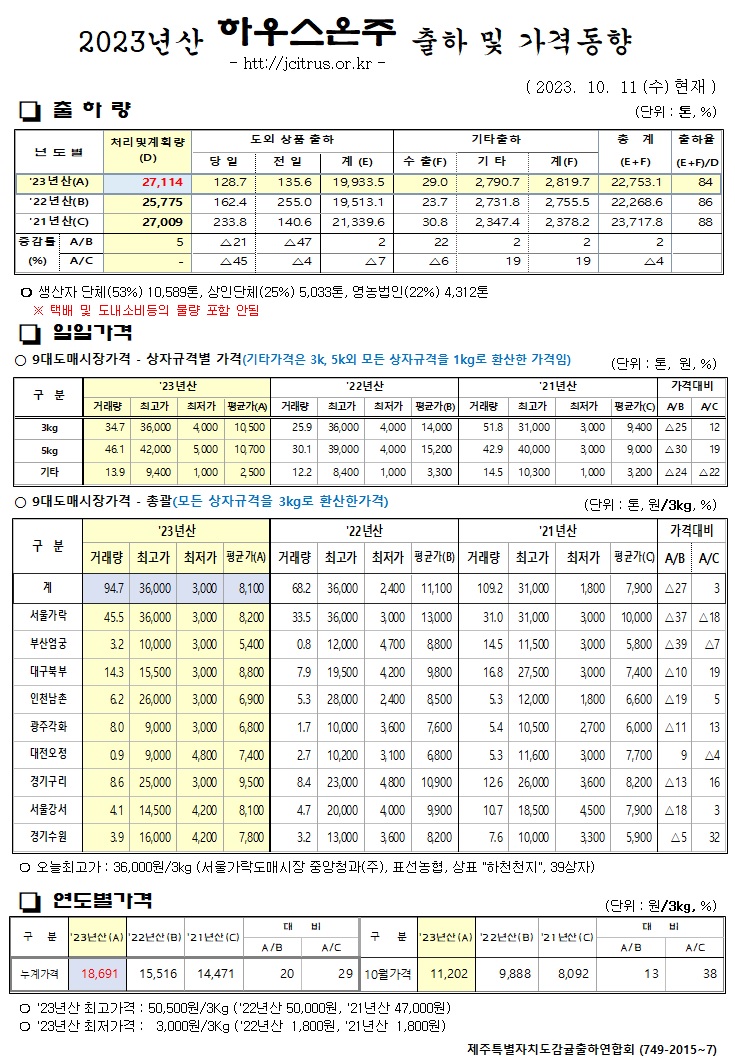 [하우스온주]2023년산 출하 및 가격동향(10/11)