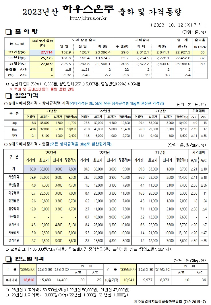 [하우스온주]2023년산 출하 및 가격동향(10/12)
