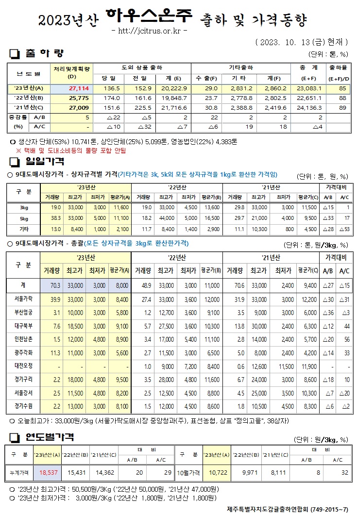 [하우스온주]2023년산 출하 및 가격동향(10/13)