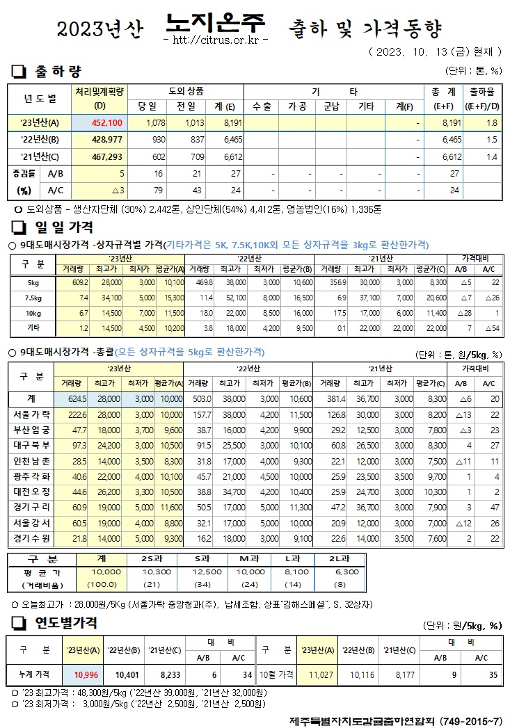 [노지온주]2023년산 출하 및 가격동향(10/13)