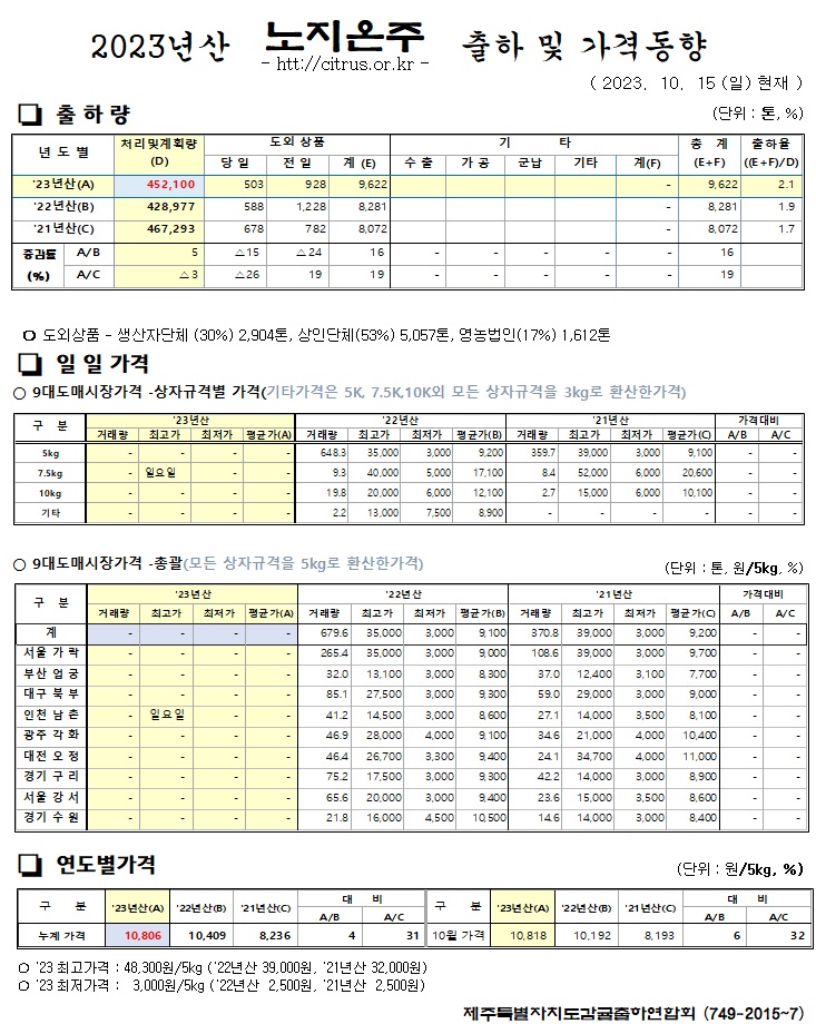 [노지온주]2023년산 출하 및 가격동향(10/15)