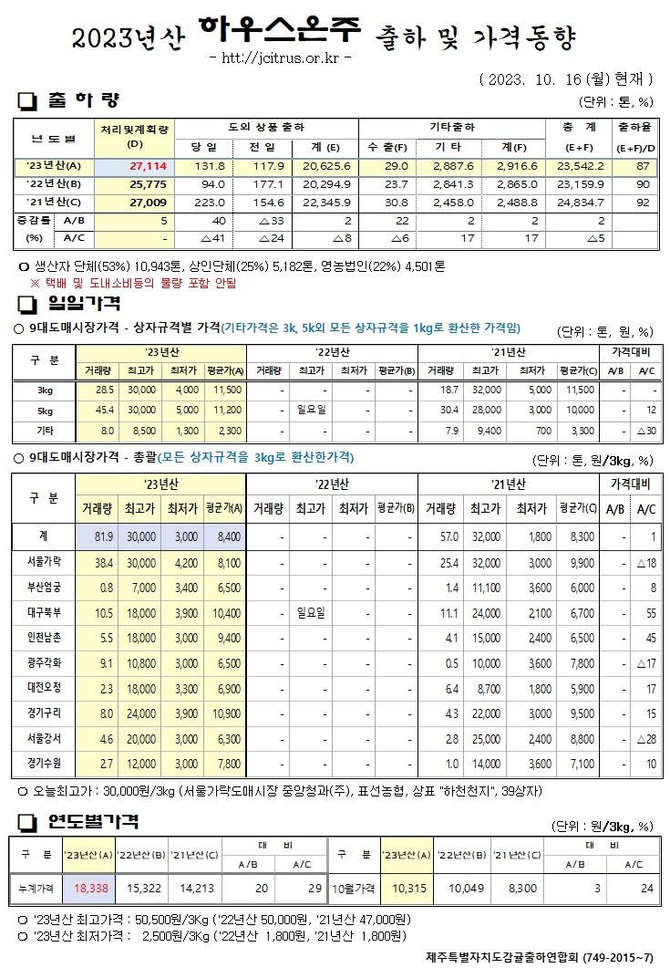 [하우스온주]2023년산 출하 및 가격동향(10/16)