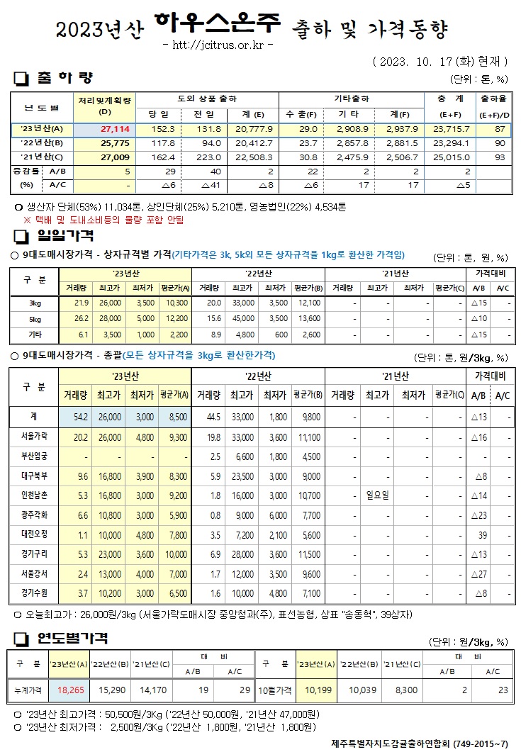 [하우스온주]2023년산 출하 및 가격동향(10/17)
