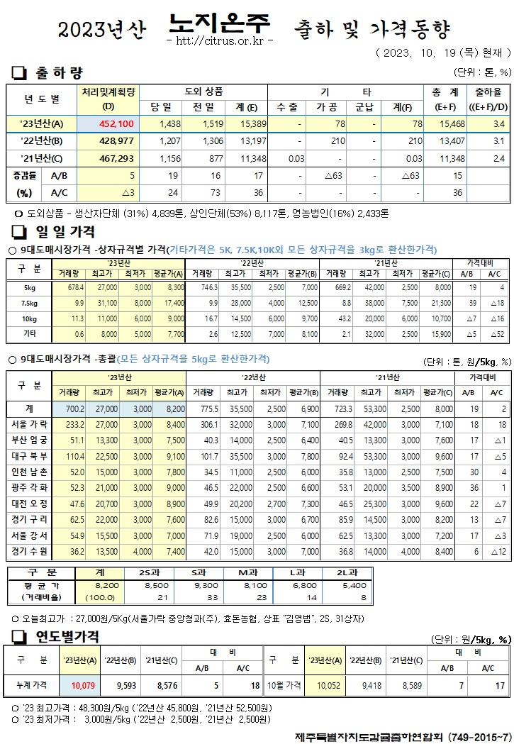 [노지온주]2023년산 출하 및 가격동향(10/19)