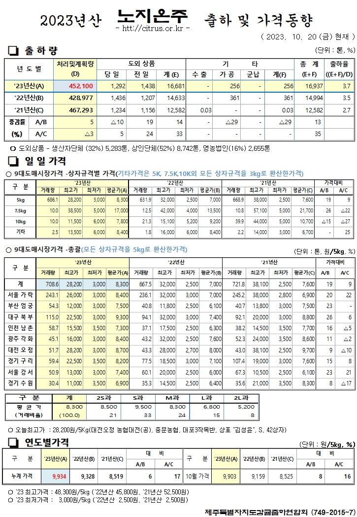 [노지온주]2023년산 출하 및 가격동향(10/20)