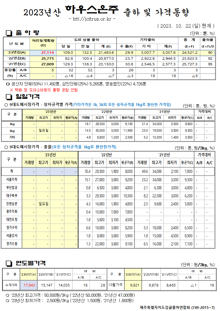 [하우스온주]2023년산 출하 및 가격동향(10/22)
