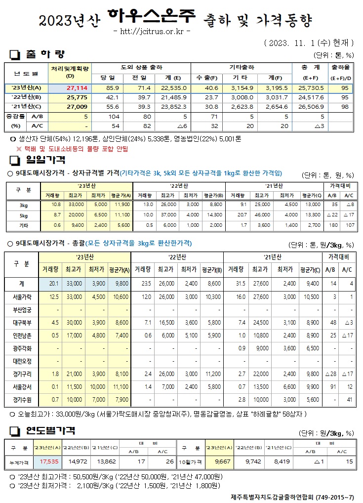 [하우스온주]2023년산 출하 및 가격동향(11/1)