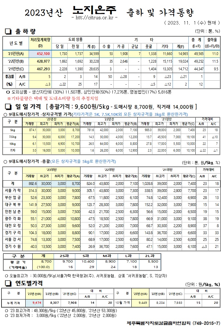 [노지온주]2023년산 출하 및 가격동향(11/1)