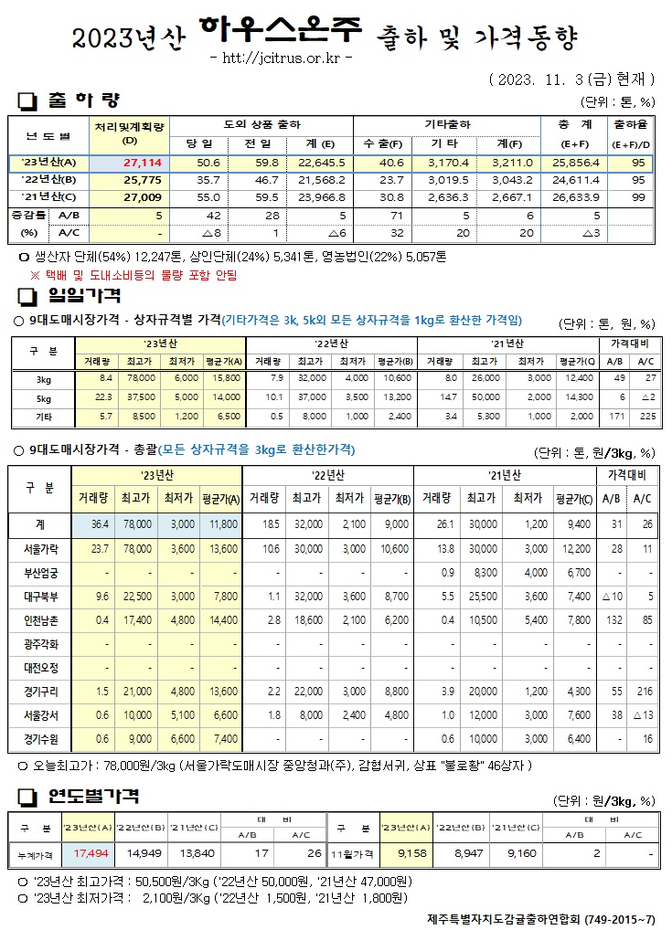 [하우스온주]2023년산 출하 및 가격동향(11/3)