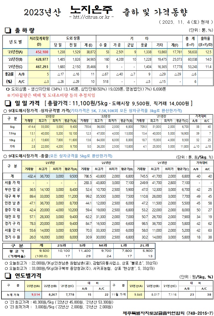 [노지온주]2023년산 출하 및 가격동향(11/4)