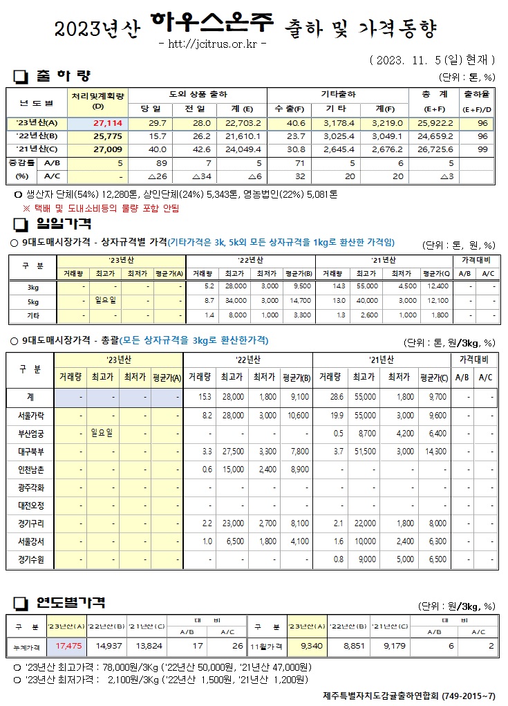 [하우스온주]2023년산 출하 및 가격동향(11/5)