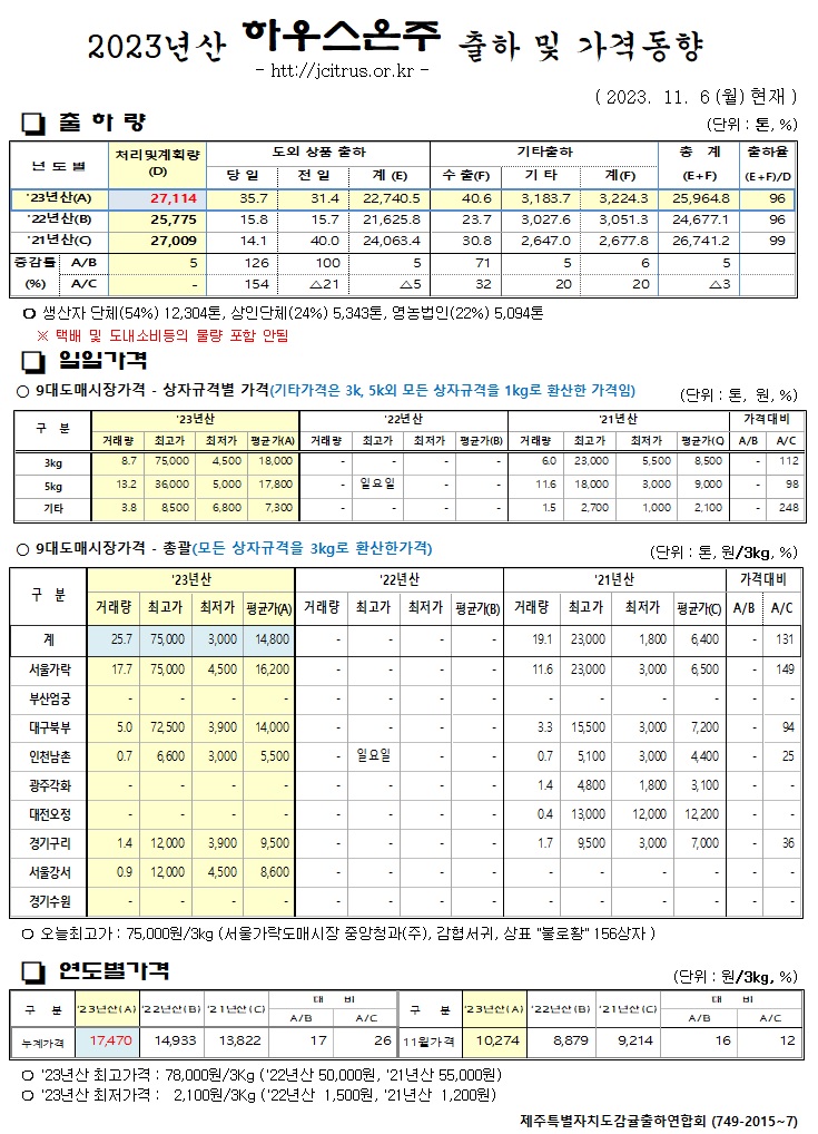 [하우스온주]2023년산 출하 및 가격동향(11/6)
