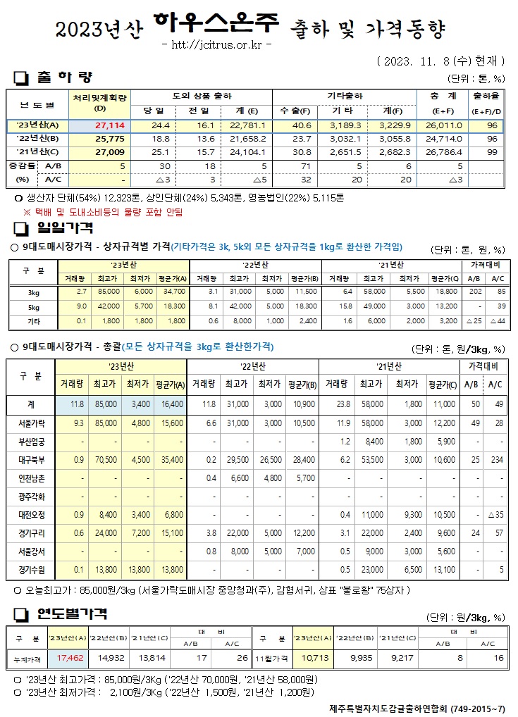[하우스온주]2023년산 출하 및 가격동향(11/8)