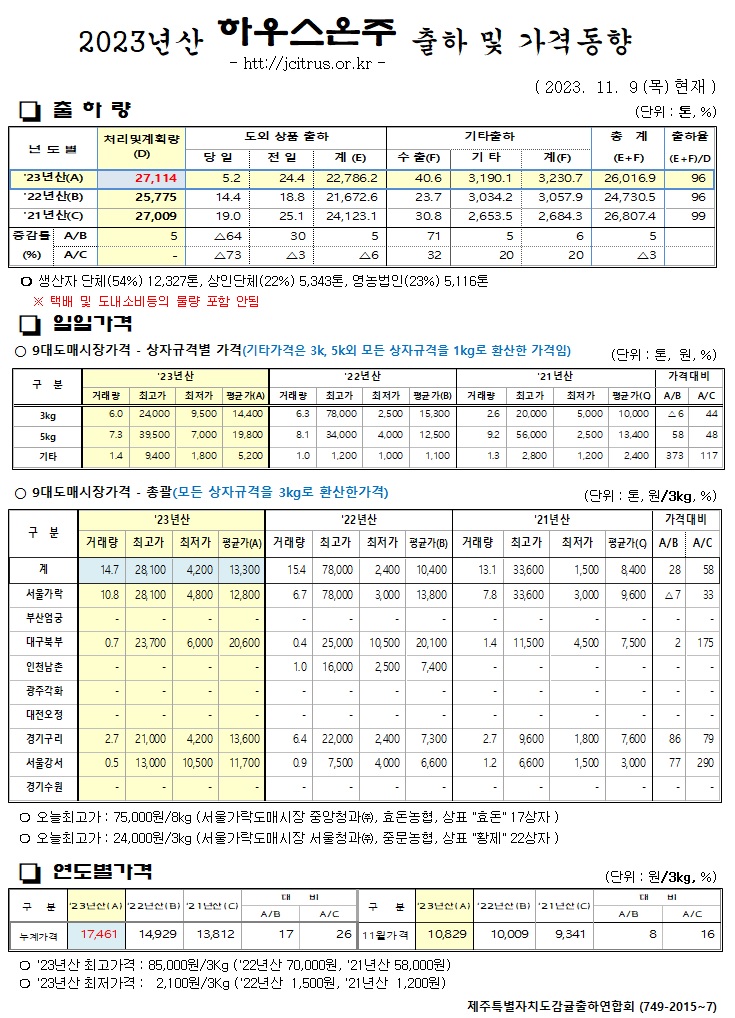 [하우스온주]2023년산 출하 및 가격동향(11/9)