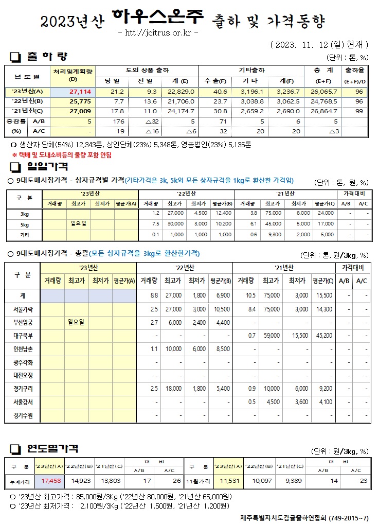 [하우스온주]2023년산 출하 및 가격동향(11/12)
