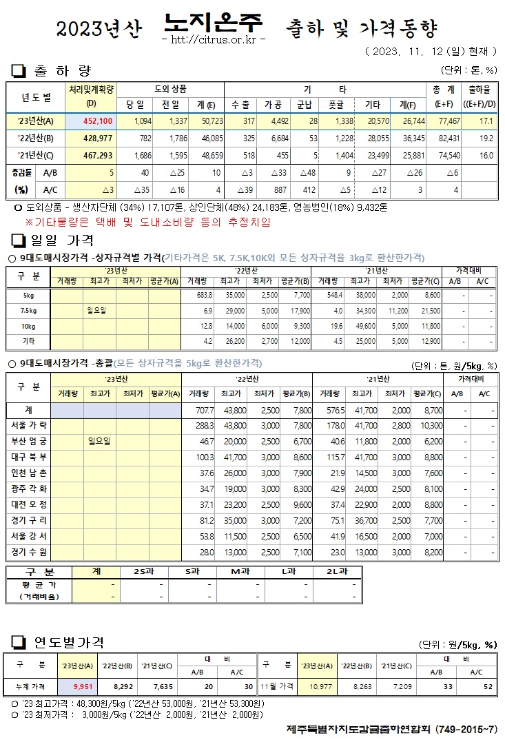 [노지온주]2023년산 출하 및 가격동향(11/12)