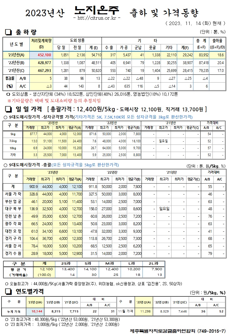 [노지온주]2023년산 출하 및 가격동향(11/14)