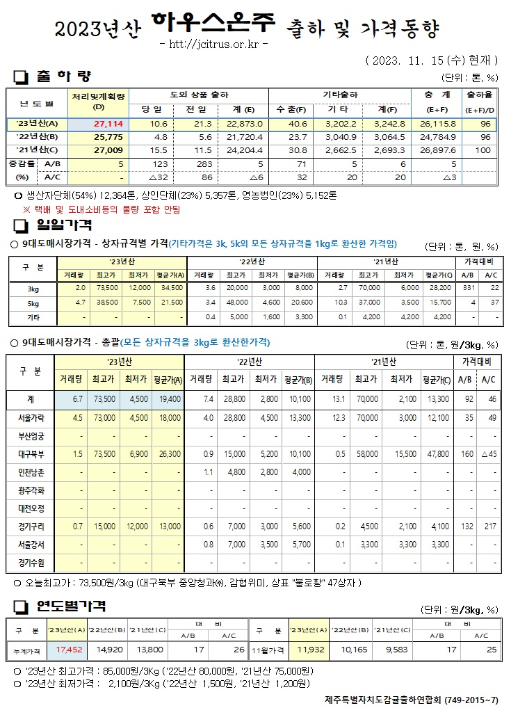 [하우스온주]2023년산 출하 및 가격동향(11/15)