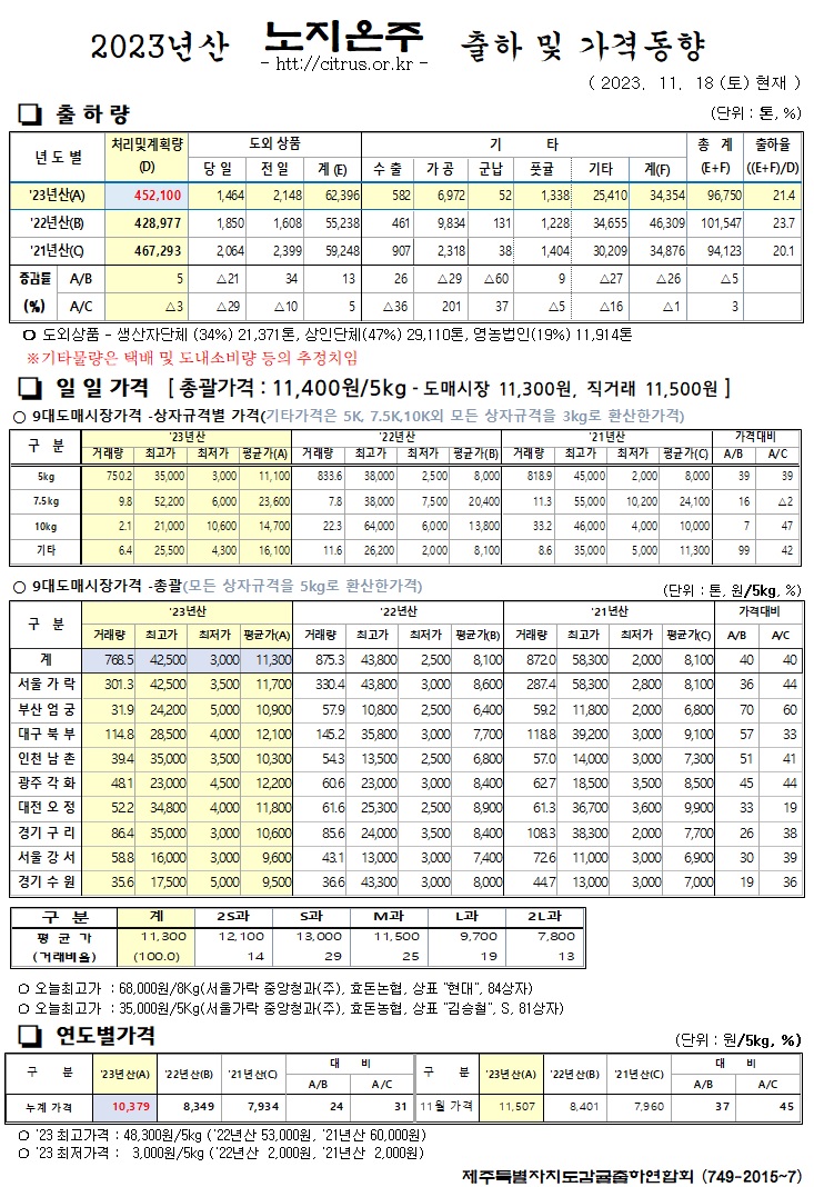 [노지온주]2023년산 출하 및 가격동향(11/18)