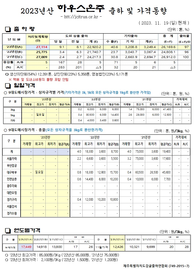 [하우스온주]2023년산 출하 및 가격동향(11/19)