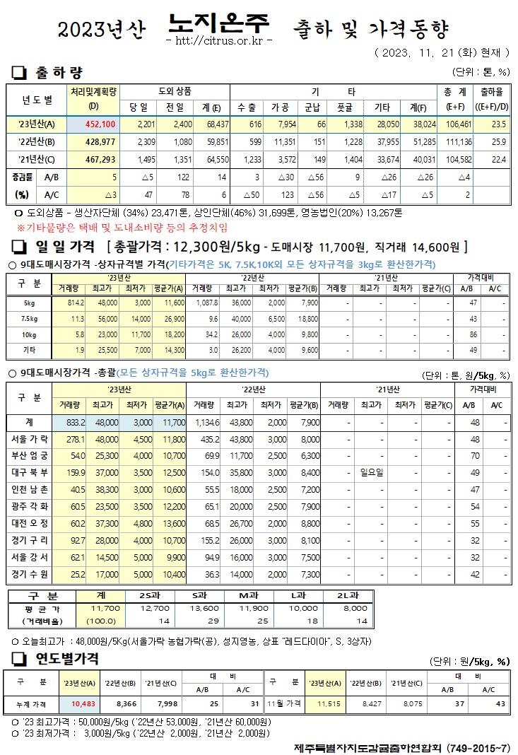 [노지온주]2023년산 출하 및 가격동향(11/21)