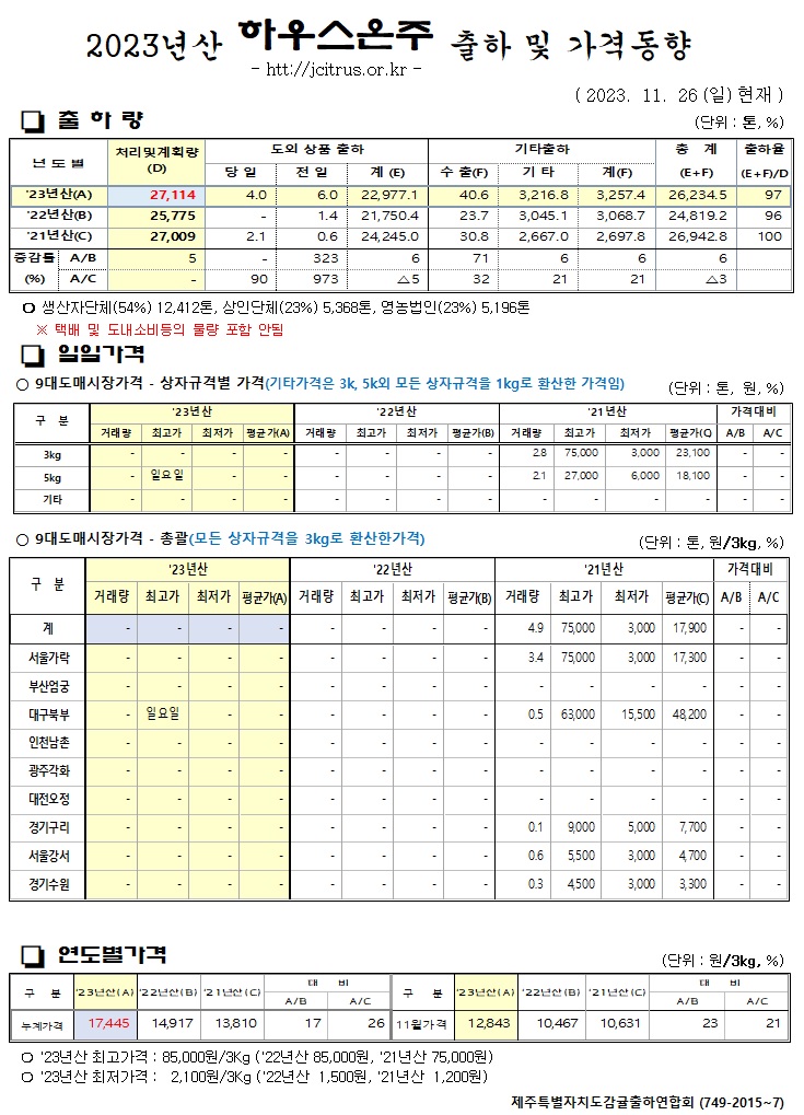 [하우스온주]2023년산 출하 및 가격동향(11/26)