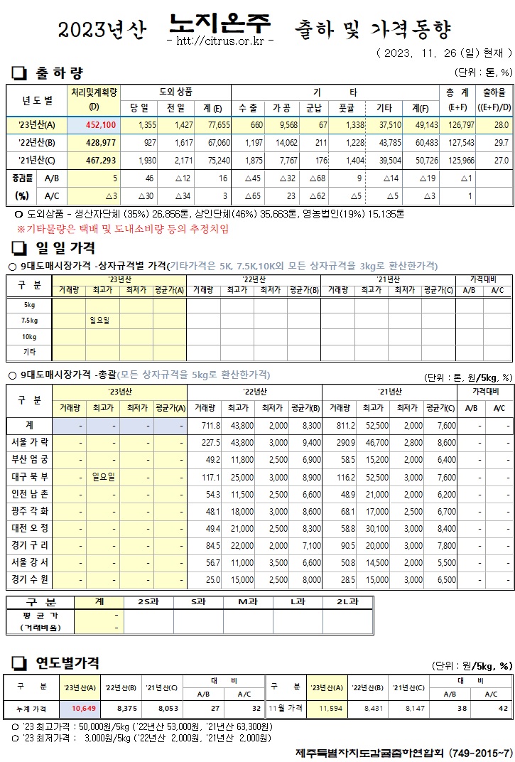 [노지온주]2023년산 출하 및 가격동향(11/26)
