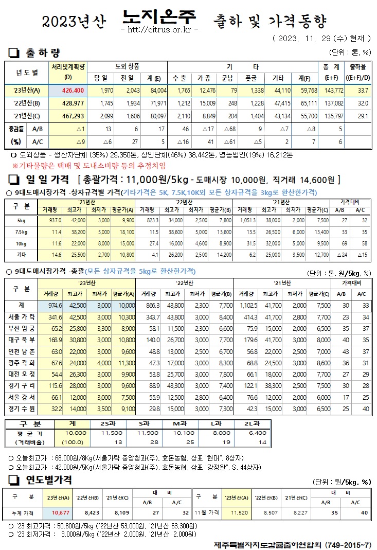 [노지온주]2023년산 출하 및 가격동향(11/29)