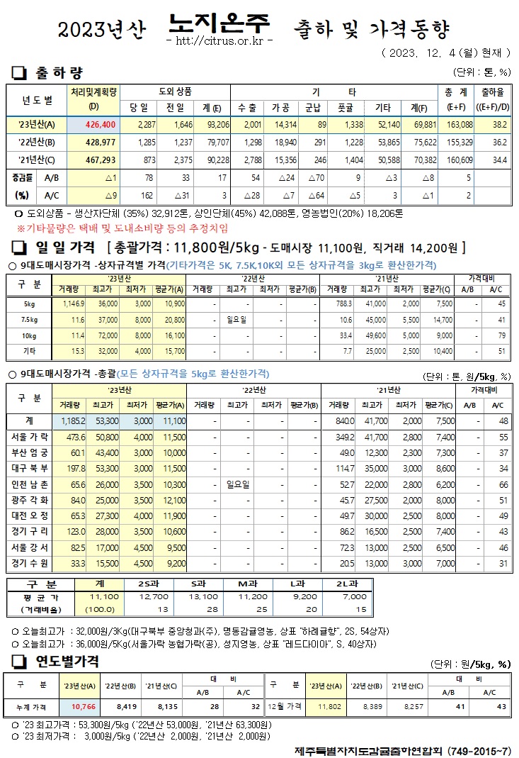 [노지온주]2023년산 출하 및 가격동향(12/4)