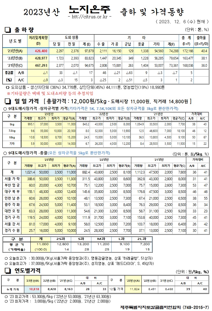 [노지온주]2023년산 출하 및 가격동향(12/6)