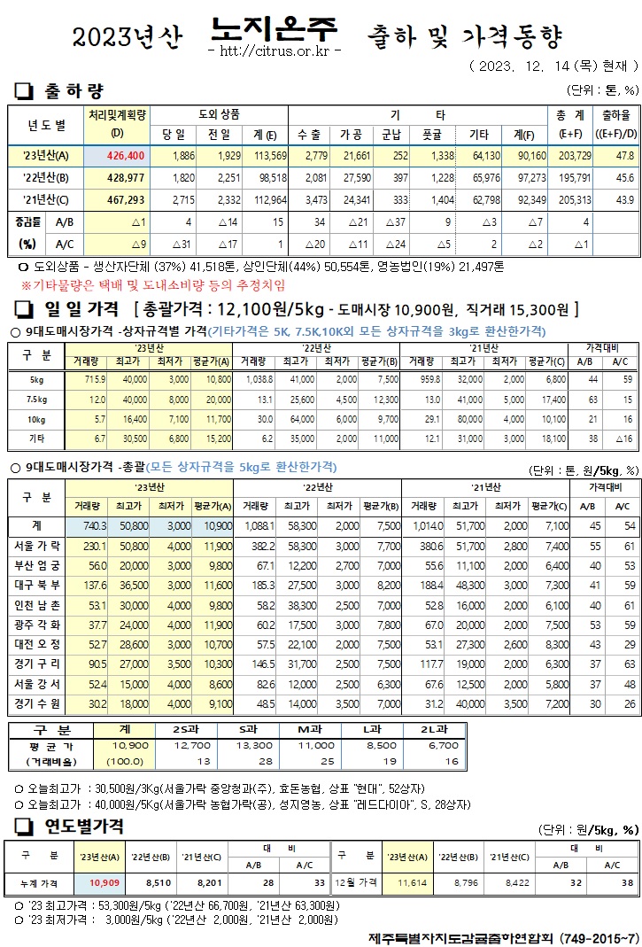 [노지온주]2023년산 출하 및 가격동향(12/14)