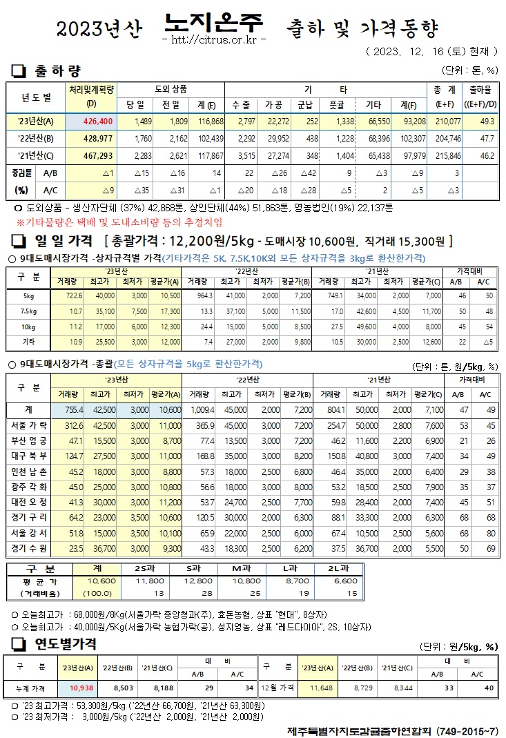 [노지온주]2023년산 출하 및 가격동향(12/16)