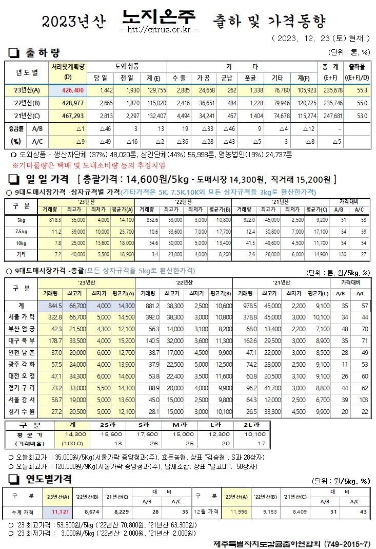 [노지온주]2023년산 출하 및 가격동향(12/23)
