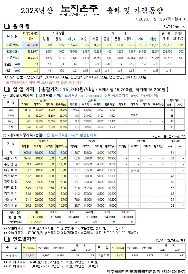 [노지온주]2023년산 출하 및 가격동향(12/26)