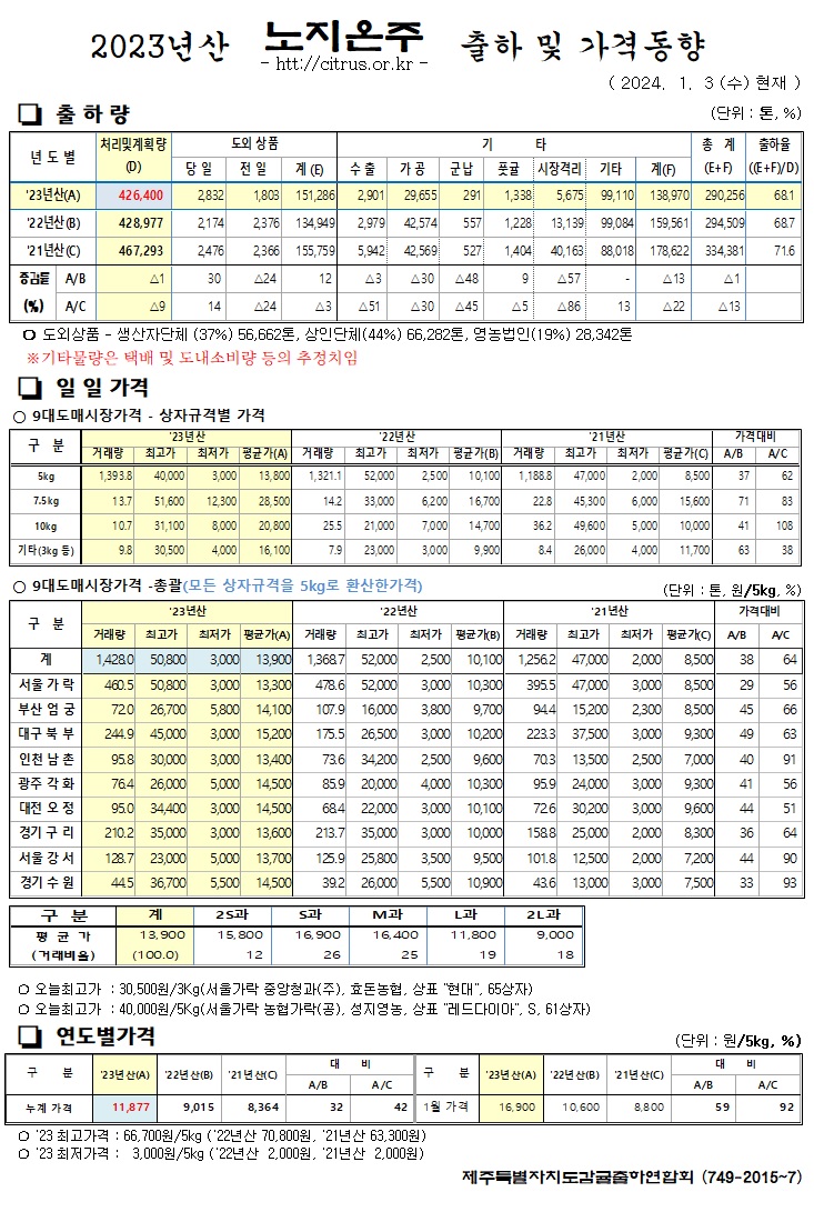 [노지온주]2023년산 출하 및 가격동향(1/3)