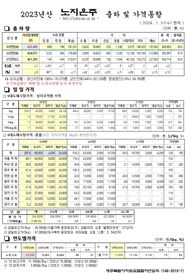 [노지온주]2023년산 출하 및 가격동향(1/31)