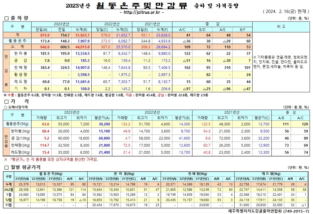 [월동&만감]2023년산 출하 및 가격동향(2/16)