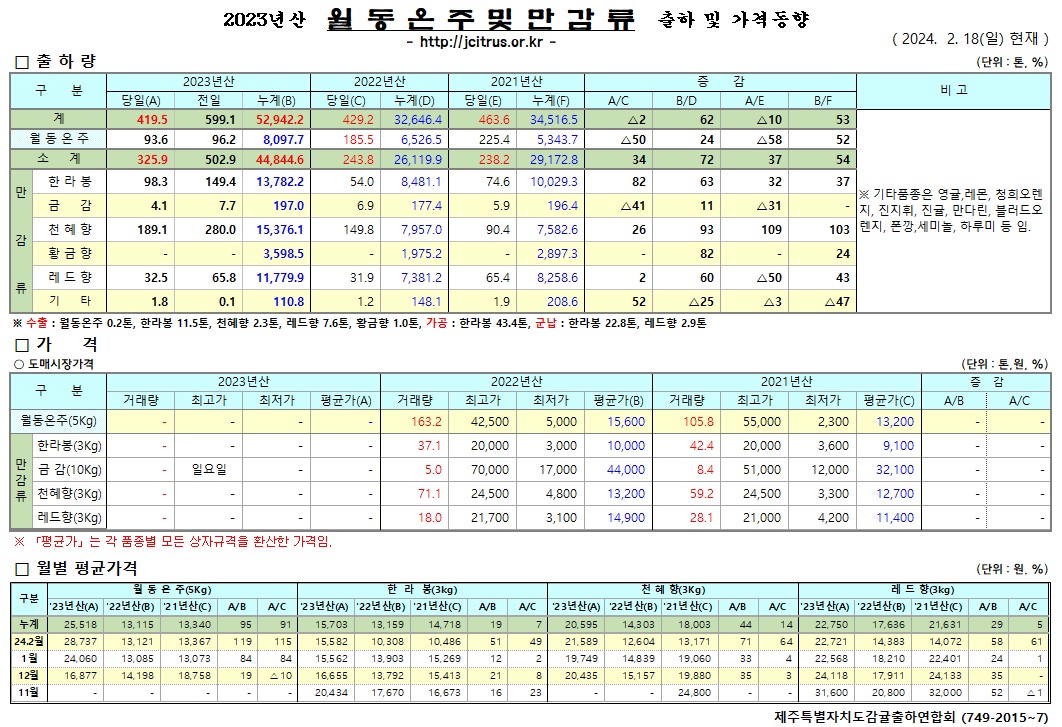 [월동&만감]2023년산 출하 및 가격동향(2/18)